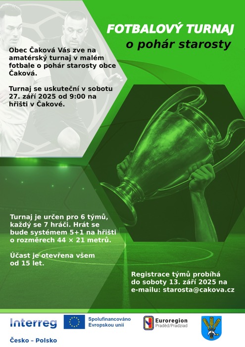 Obec Čaková zve zájemce na turnaj v malém fotbale.