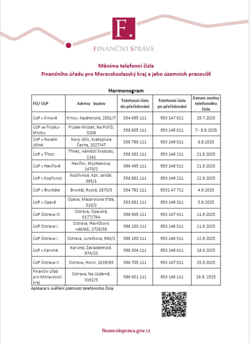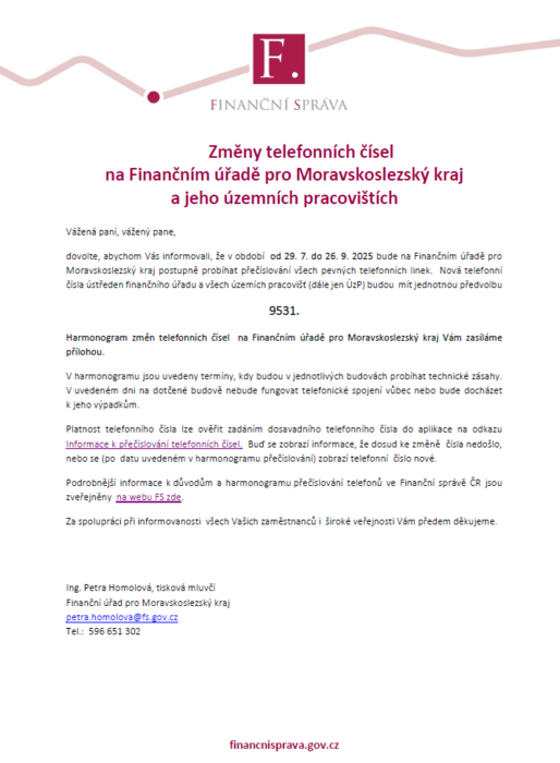 Na Finančním úřadě pro Moravskoslezský kraj a všech jeho územních pracovištích bude od 29. 7. 2025 do 26. 9. 2025 probíhat přečíslování všech pevných telefonních linek