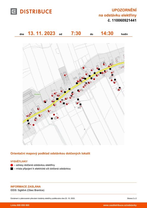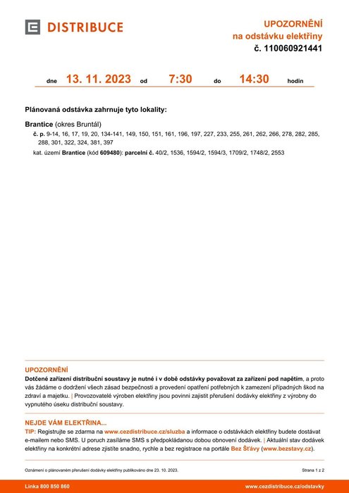 ČEZ Distribuce, a.s., upozorňuje na plánovanou odstávku elektřiny v části naší obce.
