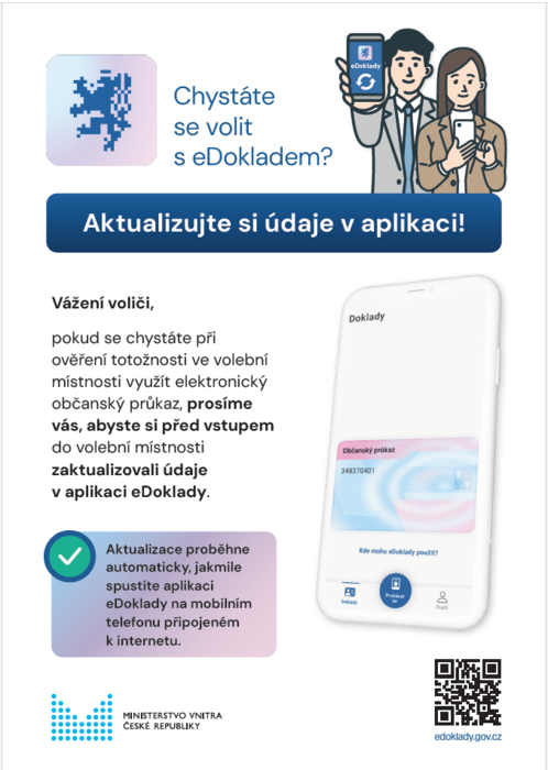 pokud se chytáte při ověření totožnosti ve volební místnosti využít elektronický občanský průkaz, prosíme vás, abyste si před vstupem do volební místnosti zaktualizovali údaje v aplikaci eDoklady.