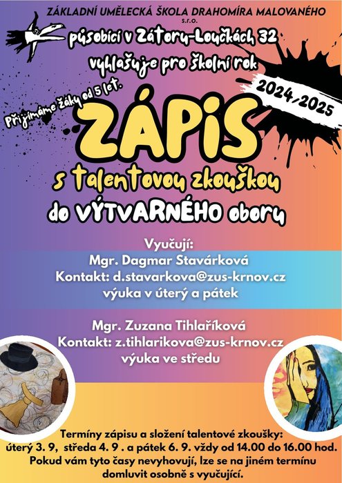 Zápis do výtvarného oboru ZUŠ Drahomíra Malovaného bude ve dnech 3.9., 4.9. a 6.9. 2024 vždy od 14:00 do16:00 hod. v Zátoru - Loučkách 32.