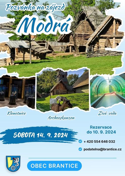 Informujeme obyvatele, kteří se přihlásili na zájezd do Modré, že z důvodu nepříznivé předpovědi počasí zájezd neproběhne v sobotu 14. září 2024, ale bude uskutečněn v náhradním termínu - v neděli 22. září 2024. Čas odjezdu zůstává stejný v 6.30 hodin z autobusových zastávek v Branticích. Případní noví zájemci se ještě mohou přihlásit na Obecním úřadě v Branticích.